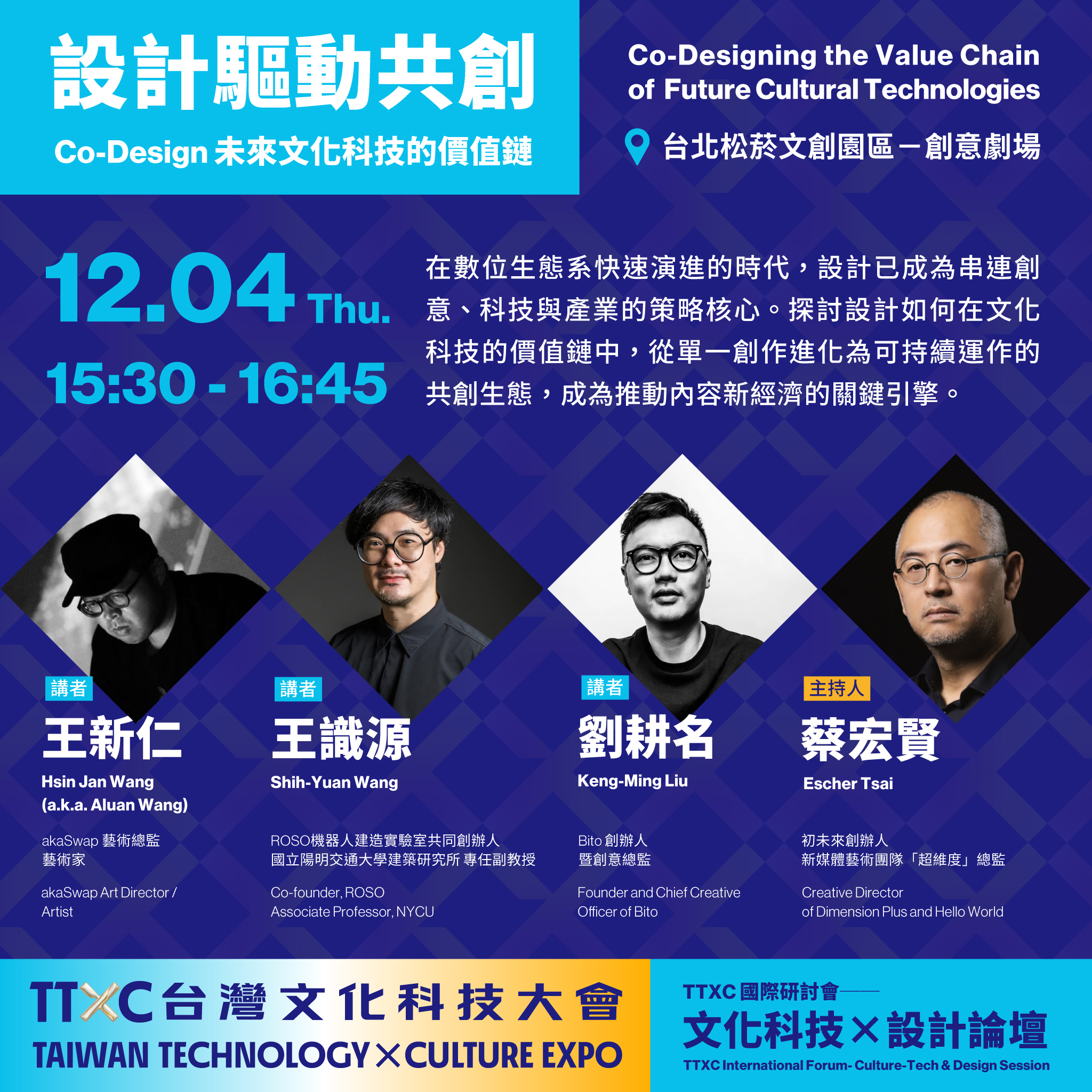在生成式 AI、沉浸式內容與數位生態系快速演進的時代,設計已不僅是美學的語言,更成為串連創意、科技與產業的策略核心。本講座以「設計驅動共創」為主題,探討設計如何在文化科技的價值鏈中,從單一創作進化為可持續運作的共創生態,成為推動內容新經濟的關鍵引擎。